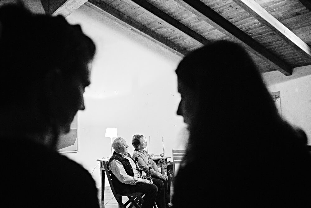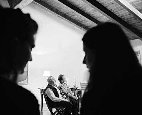 Modrost je bila vsekakor vodilna nit dogodka. Sprva predvsem modrost, ki je povezana z žensko-moškim principom in z odnosi v preteklosti in danes. To je bila tema POGOVOROV O STARIH MODROSTIH. Zgodbe o kulturi plesov, ki so se pred leti izvajali v Brdih ter o starih navadah in šegah na področju odnosov, ki so se spletli na vaških zabavah, sta nam povedala sogovornika, Brica, gospa GABRIJELA ZAMAR ter gospod KONRAD KLINEC. Delila sta modrosti moško-ženskih razmerij, ki so se večkrat ustvarile s pomočjo plesa in so pomembne za našo naravno kulturo dediščino.